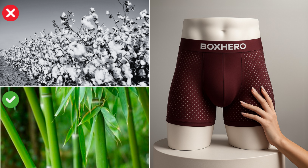 Most underwear uses cotton or synthetic polyester — materials that seem soft at first, but trap heat, absorb sweat, and rub the skin raw.